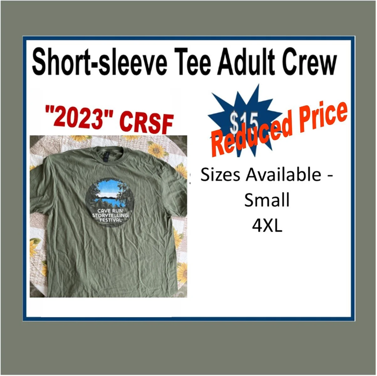 Tickets › "2023 CRSF" Short-sleeve Tee Adult Crew Image 1 of 2 Image 2 of 2 "2023 CRSF" Short-sleeve Tee Adult Crew Sale Price: $12.00 Original Price: $15.00 Size (reduced price of $12 includes tax): Small 4XL Add To Cart Added! Student Support Sponsor $6.00 Add Added!